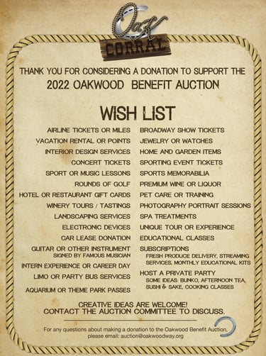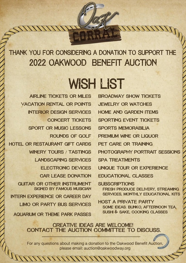 The 2022 Oakwood Corral Dinner Auction was held on September 23, which aims to raise funds for Oakwood School's programs and initiatives. It is a community event that brings together parents, staff, alumni, and supporters of the school. The auction features a variety of items up for bidding, such as unique experiences, artwork, vacations, and other valuable items.